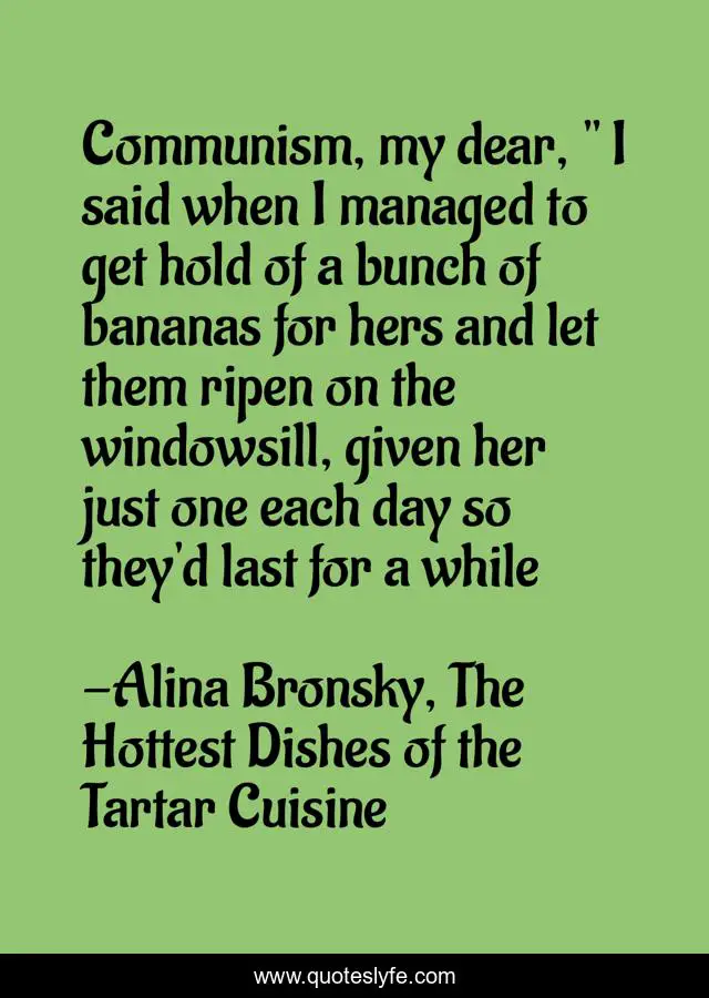 This page presents the quote "Communism, my dear, " I said when I managed to get hold of a bunch of bananas for hers and let them ripen on the windowsill, given her just one each day so they'd last for a while". Author of this quote is Alina Bronsky, The Hottest Dishes of the Tartar Cuisine. .