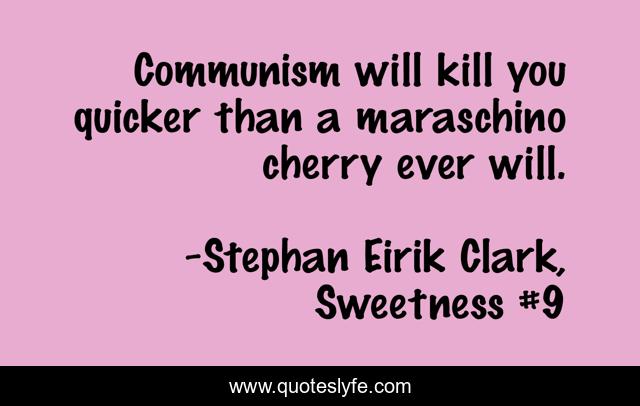 This page presents the quote "Communism will kill you quicker than a maraschino cherry ever will.". Author of this quote is Stephan Eirik Clark, Sweetness #9. This quote is about food, food-for-thought, communism, humor,.