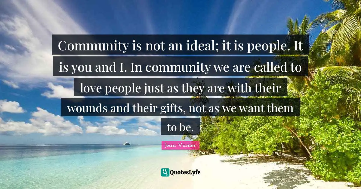 This page presents the quote "Community is not an ideal; it is people. It is you and I. In community we are called to love people just as they are with their wounds and their gifts, not as we want them to be.". Author of this quote is Jean Vanier. This quote is about love, people, wounds, want, community,.