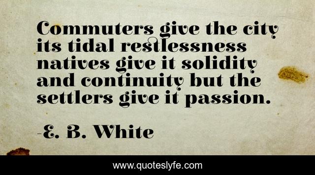 This page presents the quote "Commuters give the city its tidal restlessness natives give it solidity and continuity but the settlers give it passion.". Author of this quote is E. B. White. This quote is about city, country,.