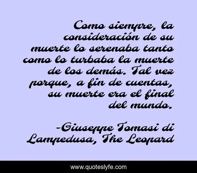 This page presents the quote "Como siempre, la consideración de su muerte lo serenaba tanto como lo turbaba la muerte de los demás. Tal vez porque, a fin de cuentas, su muerte era el final del mundo.". Author of this quote is Giuseppe Tomasi di Lampedusa, The Leopard. .