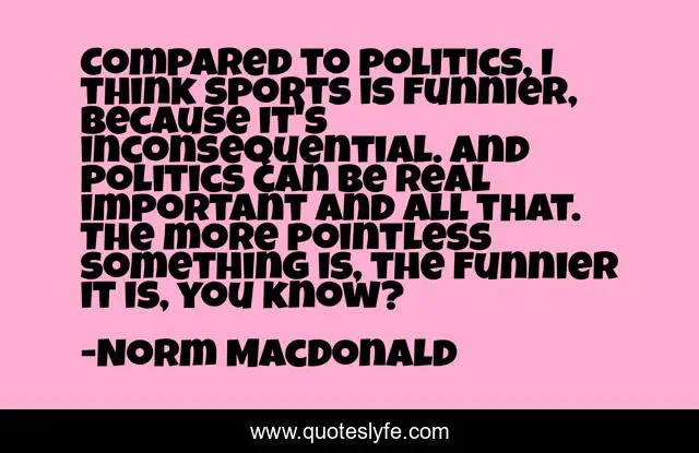 This page presents the quote "Compared to politics, I think sports is funnier, because it's inconsequential. And politics can be real important and all that. The more pointless something is, the funnier it is, you know?". Author of this quote is Norm MacDonald. This quote is about politics, think,.