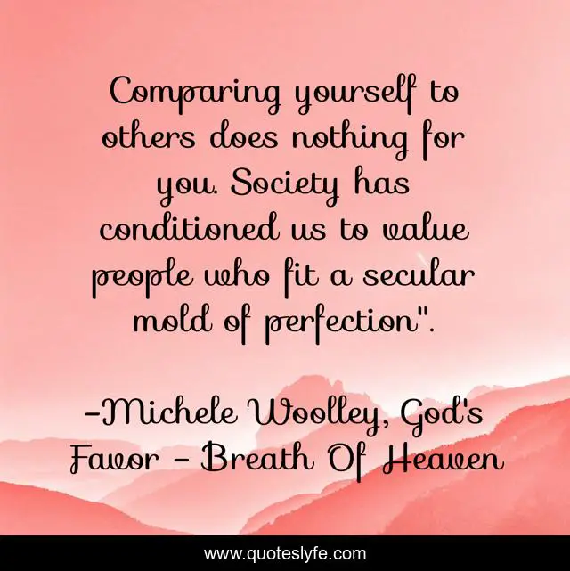 This page presents the quote "Comparing yourself to others does nothing for you. Society has conditioned us to value people who fit a secular mold of perfection".". Author of this quote is Michele Woolley, God's Favor - Breath Of Heaven. This quote is about faith, christian-community, favor, self-help,.