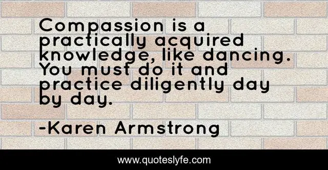 This page presents the quote "Compassion is a practically acquired knowledge, like dancing. You must do it and practice diligently day by day.". Author of this quote is Karen Armstrong. This quote is about compassion, practice, day,.