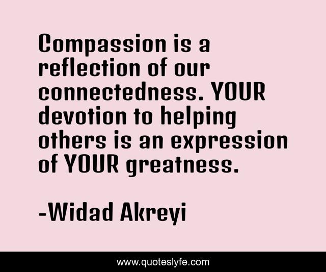 This page presents the quote "Compassion is a reflection of our connectedness. YOUR devotion to helping others is an expression of YOUR greatness.". Author of this quote is Widad Akreyi. This quote is about widad-akrawi, peace, mediation, inspirational, conflicts, enthusiasm, humanity, charity,.
