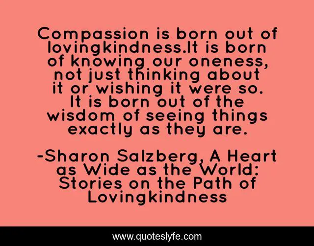 This page presents the quote "Compassion is born out of lovingkindness.It is born of knowing our oneness, not just thinking about it or wishing it were so. It is born out of the wisdom of seeing things exactly as they are.". Author of this quote is Sharon Salzberg, A Heart as Wide as the World: Stories on the Path of Lovingkindness. This quote is about love, mindfulness, compassion, meditation, education, affection,.