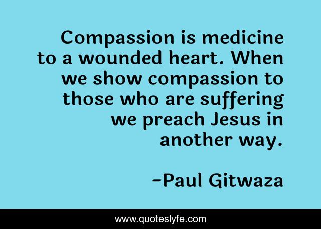 This page presents the quote "Compassion is medicine to a wounded heart. When we show compassion to those who are suffering we preach Jesus in another way.". Author of this quote is Paul Gitwaza. This quote is about compassion, jesus-christ, medicine, preaching, wounds,.