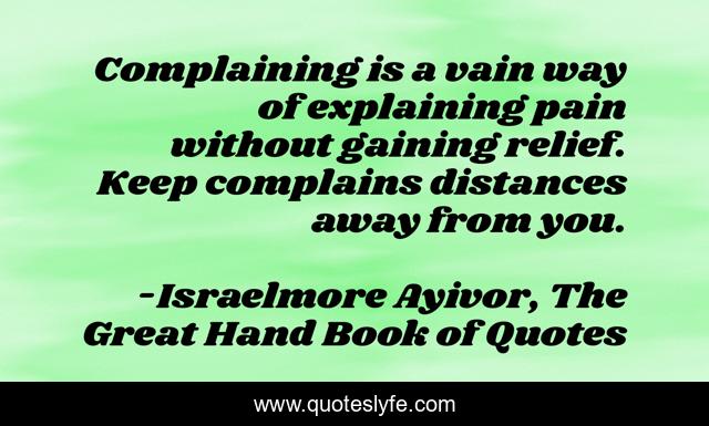 This page presents the quote "Complaining is a vain way of explaining pain without gaining relief. Keep complains distances away from you.". Author of this quote is Israelmore Ayivor, The Great Hand Book of Quotes. This quote is about distance, food-for-thought, pain, complaining, explain, keep, gain, way, complaints,.