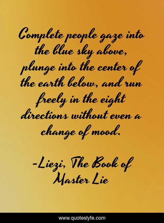 This page presents the quote "Complete people gaze into the blue sky above, plunge into the center of the earth below, and run freely in the eight directions without even a change of mood.". Author of this quote is Liezi, The Book of Master Lie. This quote is about blue-sky, earth, complete, mood,.