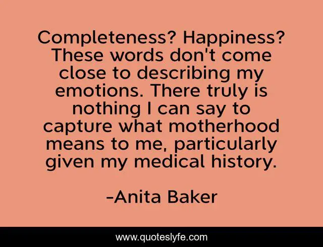 This page presents the quote "Completeness? Happiness? These words don't come close to describing my emotions. There truly is nothing I can say to capture what motherhood means to me, particularly given my medical history.". Author of this quote is Anita Baker. This quote is about motherhood, mom, history,.