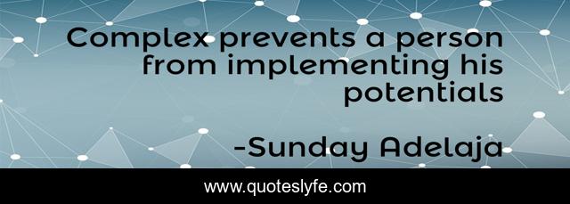 This page presents the quote "Complex prevents a person from implementing his potentials". Author of this quote is Sunday Adelaja. This quote is about life, goal, mission, calling, implementing, complex, purpose, potentials,.