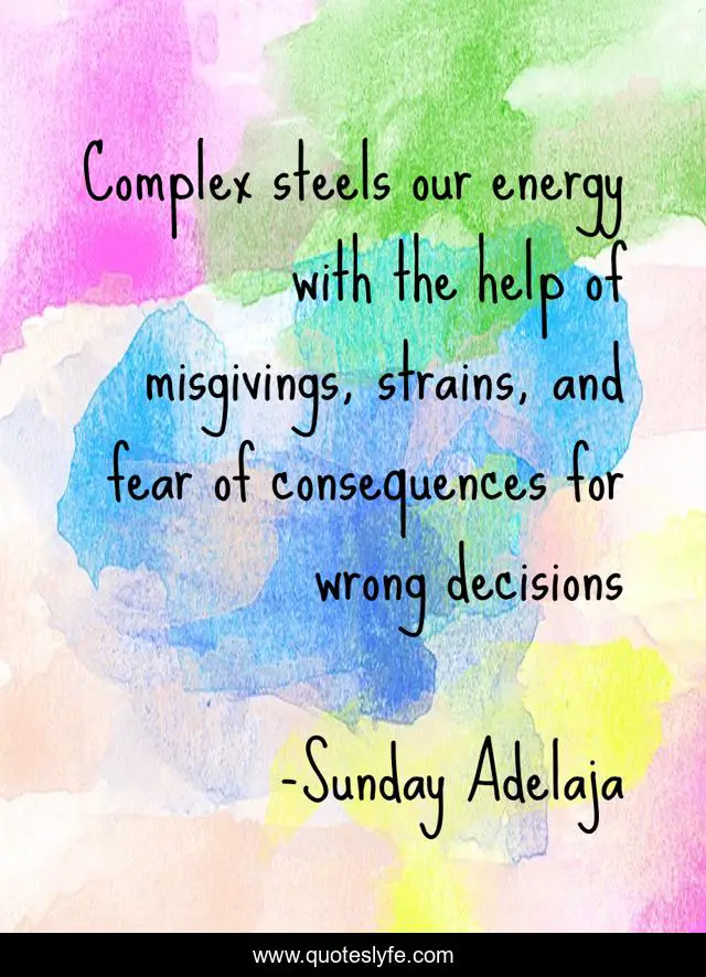 This page presents the quote "Complex steels our energy with the help of misgivings, strains, and fear of consequences for wrong decisions". Author of this quote is Sunday Adelaja. This quote is about life, goal, energy, decision, mission, calling, strain, wrong, complex,.