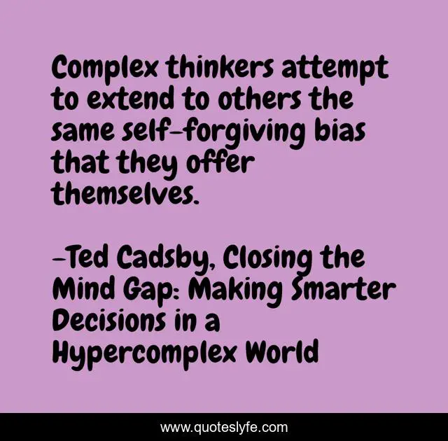 This page presents the quote "Complex thinkers attempt to extend to others the same self-forgiving bias that they offer themselves.". Author of this quote is Ted Cadsby, Closing the Mind Gap: Making Smarter Decisions in a Hypercomplex World. This quote is about compassion, complexity, decision-making, critical-thinking,.