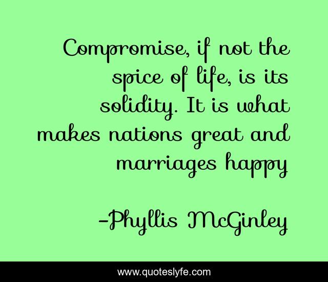 This page presents the quote "Compromise, if not the spice of life, is its solidity. It is what makes nations great and marriages happy". Author of this quote is Phyllis McGinley. This quote is about compromise, marriage, ignorance, knowledge, wisdom,.