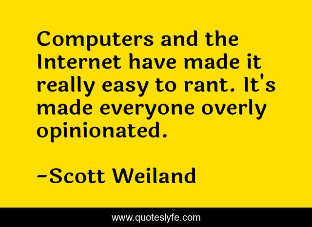 This page presents the quote "Computers and the Internet have made it really easy to rant. It's made everyone overly opinionated.". Author of this quote is Scott Weiland. This quote is about everyone, easy, internet,.
