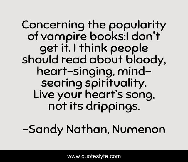 This page presents the quote "Concerning the popularity of vampire books:I don't get it. I think people should read about bloody, heart-singing, mind-searing spirituality. Live your heart’s song, not its drippings.". Author of this quote is Sandy Nathan, Numenon. This quote is about spirituality, inspiration, vamlpire, new-age,.