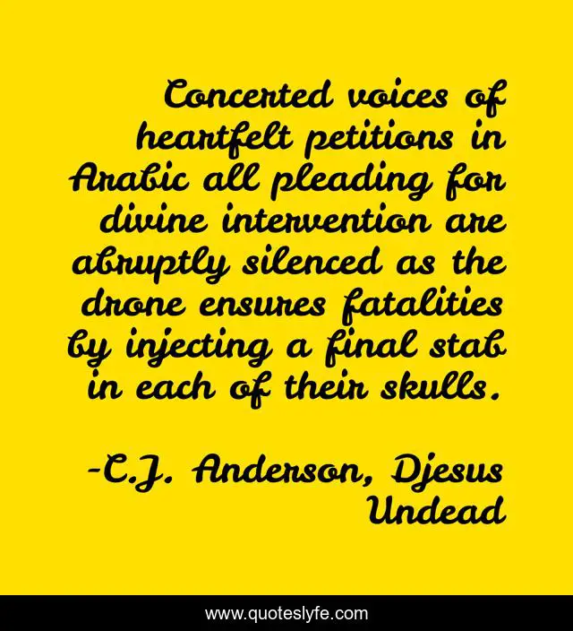 This page presents the quote "Concerted voices of heartfelt petitions in Arabic all pleading for divine intervention are abruptly silenced as the drone ensures fatalities by injecting a final stab in each of their skulls.". Author of this quote is C.J. Anderson, Djesus Undead. .