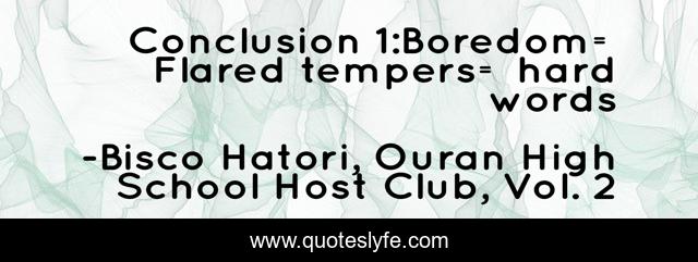This page presents the quote "Conclusion 1:Boredom= Flared tempers= hard words". Author of this quote is Bisco Hatori, Ouran High School Host Club, Vol. 2. This quote is about conclusion, ouran, words, fight,.