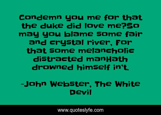 This page presents the quote "Condemn you me for that the duke did love me?So may you blame some fair and crystal river, For that some melancholic distracted manHath drowned himself in’t.". Author of this quote is John Webster, The White Devil. This quote is about guilt, love, affection,.