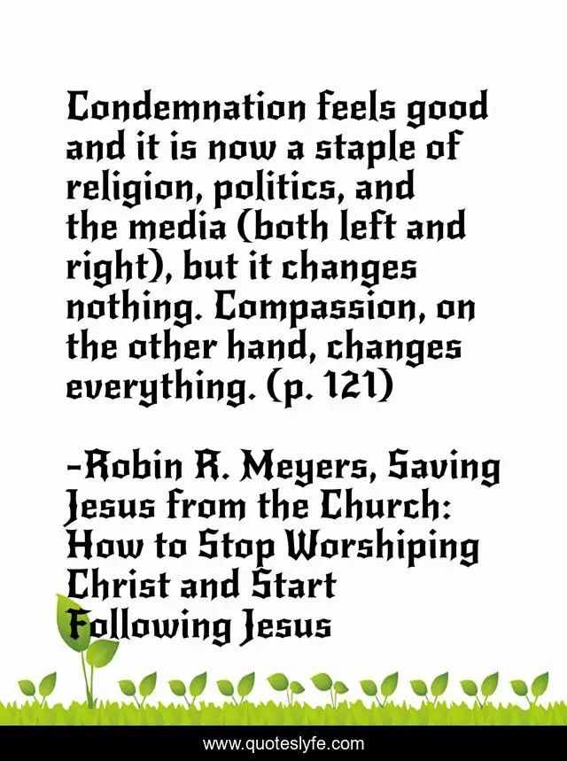 "Robin R. Meyers, Saving Jesus from the Church: How to Stop Worshiping Christ and Start Following Jesus Quotes." Quoteslyfe.com, 2025. Sun. 07 Dec. 2025. <https://www.quoteslyfe.com/quote/Condemnation-feels-good-and-it-is-now-56921>.