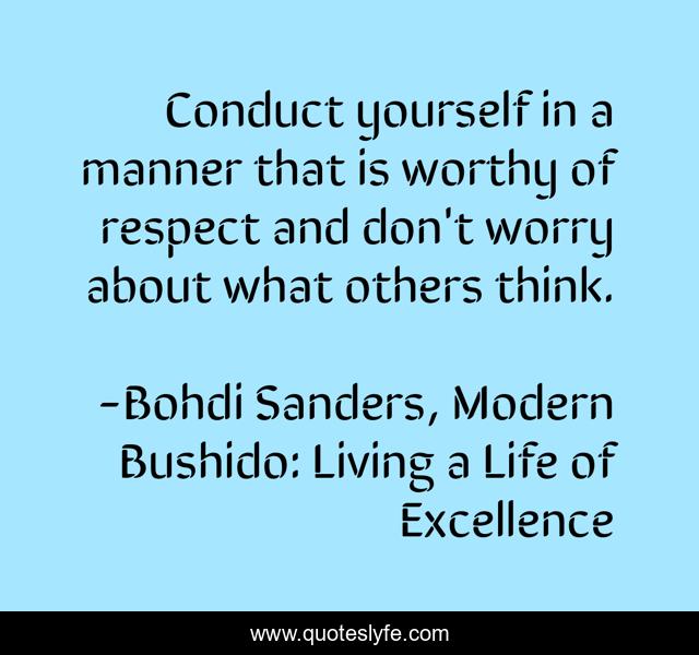 This page presents the quote "Conduct yourself in a manner that is worthy of respect and don't worry about what others think.". Author of this quote is Bohdi Sanders, Modern Bushido: Living a Life of Excellence. This quote is about confidence, motivational-inspirational, motivational, bohdi-sanders, conduct-of-life-philosophy, optimistic, inspirational, positive, respect,.