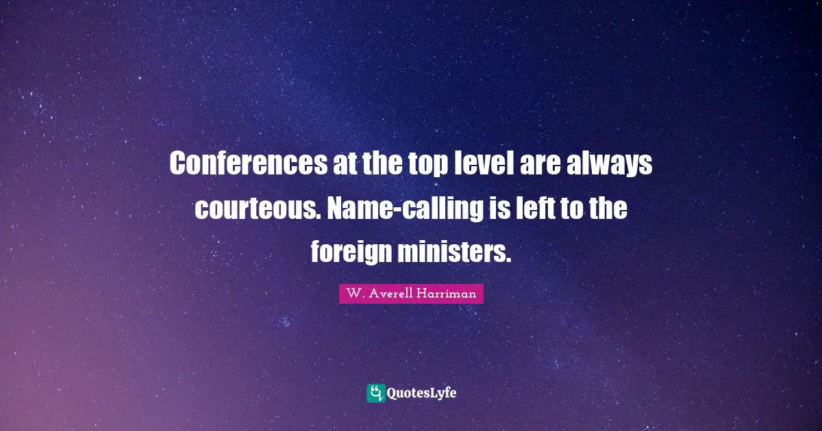 This page presents the quote "Conferences at the top level are always courteous. Name-calling is left to the foreign ministers.". Author of this quote is W. Averell Harriman. This quote is about courteous, left, names, ministers, conferences, levels, calling,.