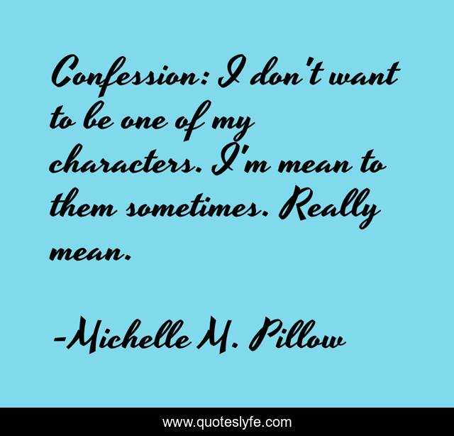 This page presents the quote "Confession: I don't want to be one of my characters. I'm mean to them sometimes. Really mean.". Author of this quote is Michelle M. Pillow. This quote is about writing-life, author, quote, writing-process, character, michelle-pillow,.