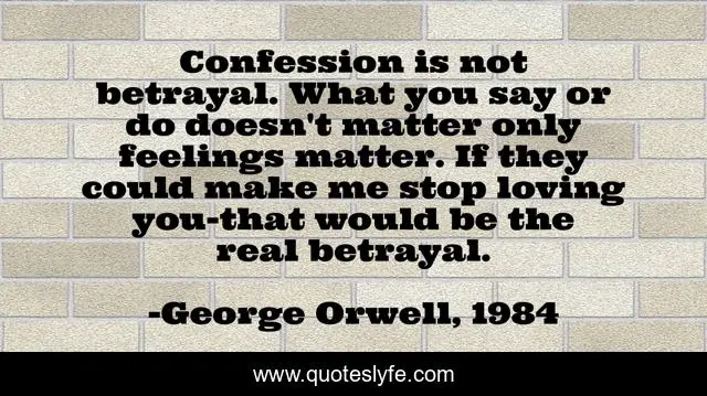 This page presents the quote "Confession is not betrayal. What you say or do doesn't matter only feelings matter. If they could make me stop loving you-that would be the real betrayal.". Author of this quote is George Orwell, 1984. This quote is about betrayal, confession, love, affection,.