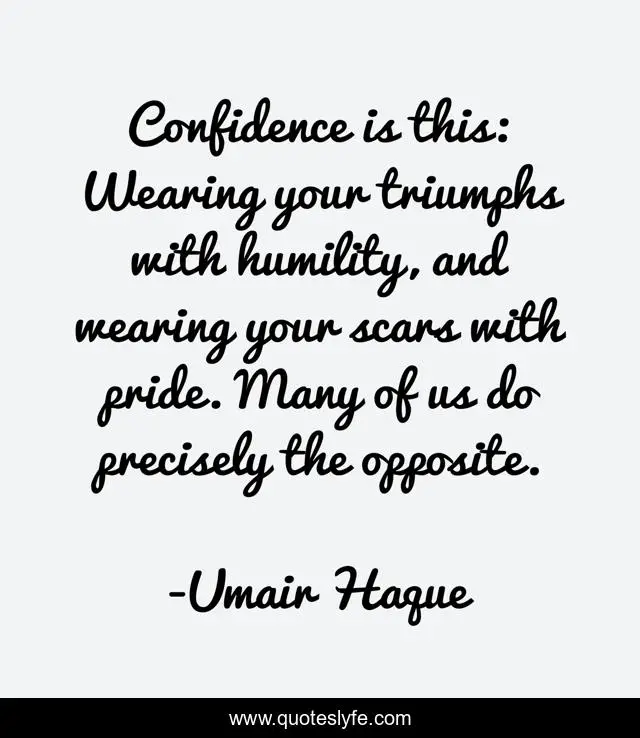 This page presents the quote "Confidence is this: Wearing your triumphs with humility, and wearing your scars with pride. Many of us do precisely the opposite.". Author of this quote is Umair Haque. This quote is about confidence, scars, life, wisdom, humility, pride, adversity,.