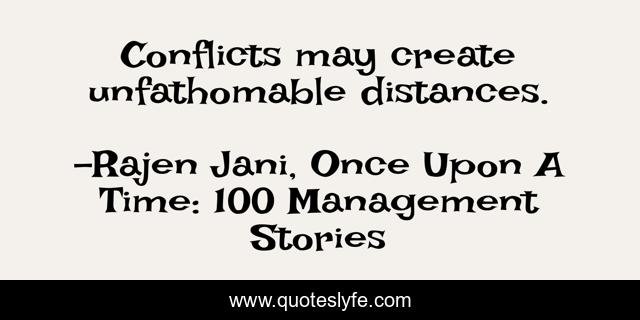 This page presents the quote "Conflicts may create unfathomable distances.". Author of this quote is Rajen Jani, Once Upon A Time: 100 Management Stories. This quote is about motivation, communication, sales, anger, improvement, quality, management, knowledge, strategy,.