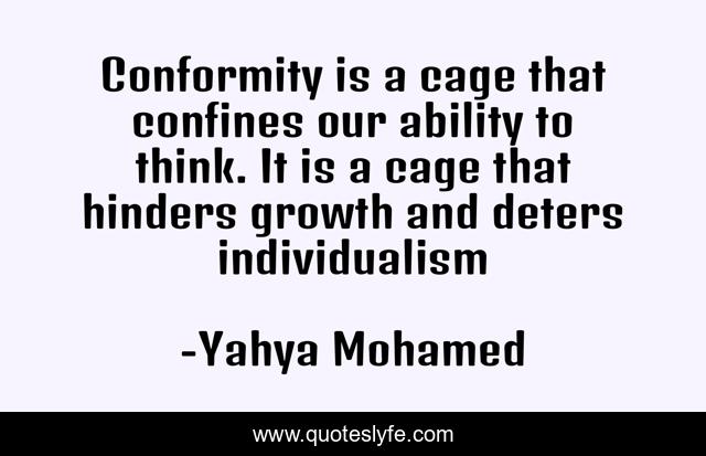 This page presents the quote "Conformity is a cage that confines our ability to think. It is a cage that hinders growth and deters individualism". Author of this quote is Yahya Mohamed. This quote is about inspirational-life, conformity,.