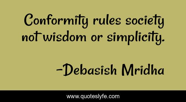 This page presents the quote "Conformity rules society not wisdom or simplicity.". Author of this quote is Debasish Mridha. This quote is about simplicity, debasish, mridha, philosophy, debasish-mridha, wisdom, society, inspirational, enthusiasm,.