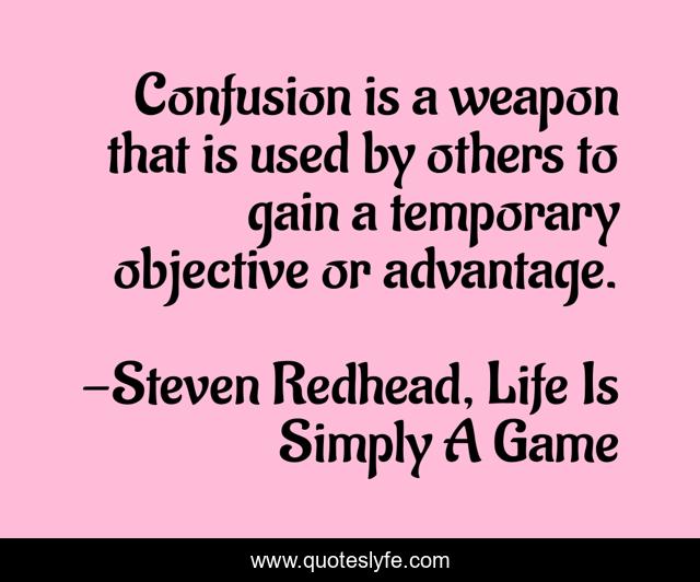 This page presents the quote "Confusion is a weapon that is used by others to gain a temporary objective or advantage.". Author of this quote is Steven Redhead, Life Is Simply A Game. This quote is about objective, confusion, gain,.