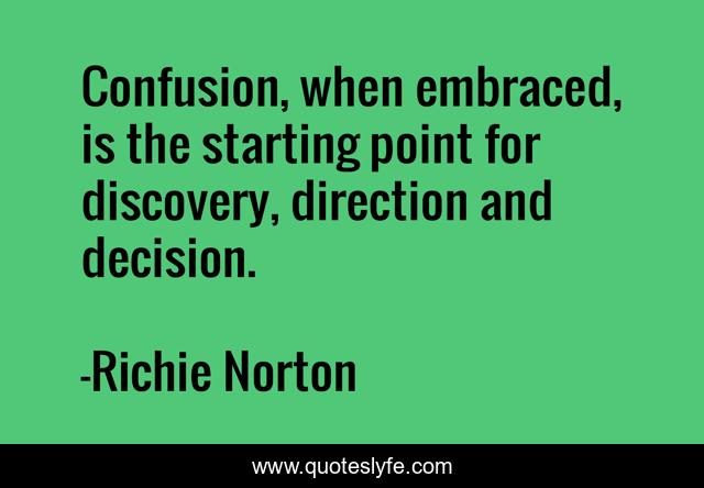 This page presents the quote "Confusion, when embraced, is the starting point for discovery, direction and decision.". Author of this quote is Richie Norton. This quote is about direction, starting-point, confusion, decision, discover, start, embrace, clarity, confusion-and-attitude,.