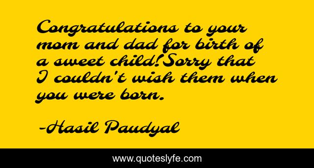 This page presents the quote "Congratulations to your mom and dad for birth of a sweet child!Sorry that I couldn't wish them when you were born.". Author of this quote is Hasil Paudyal. This quote is about funny, sweet, hasil, child, happy-birthday, hasil-paudyal, birthday, different-birthday, birth,.