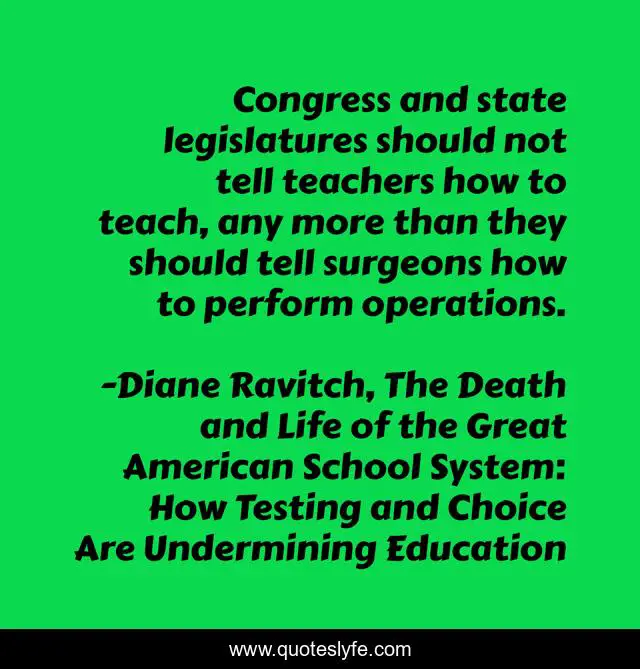 This page presents the quote "Congress and state legislatures should not tell teachers how to teach, any more than they should tell surgeons how to perform operations.". Author of this quote is Diane Ravitch, The Death and Life of the Great American School System: How Testing and Choice Are Undermining Education. .