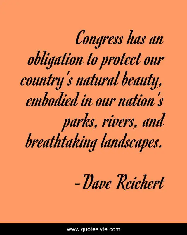 This page presents the quote "Congress has an obligation to protect our country's natural beauty, embodied in our nation's parks, rivers, and breathtaking landscapes.". Author of this quote is Dave Reichert. This quote is about natural beauty, rivers,.