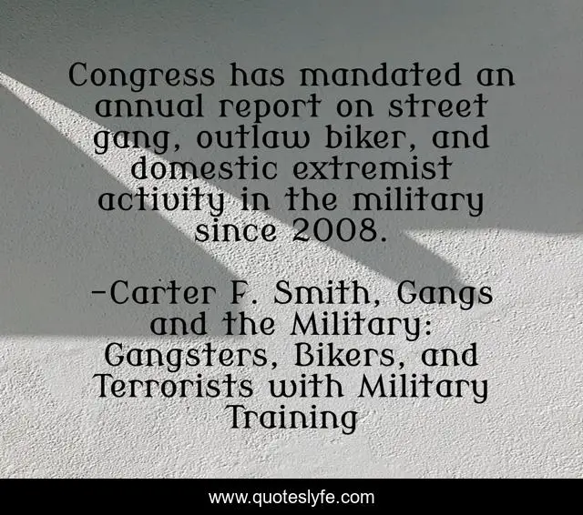 This page presents the quote "Congress has mandated an annual report on street gang, outlaw biker, and domestic extremist activity in the military since 2008.". Author of this quote is Carter F. Smith, Gangs and the Military: Gangsters, Bikers, and Terrorists with Military Training. This quote is about military, outlaw-motorcycle-gangs, gangs, military-history, terrorists,.