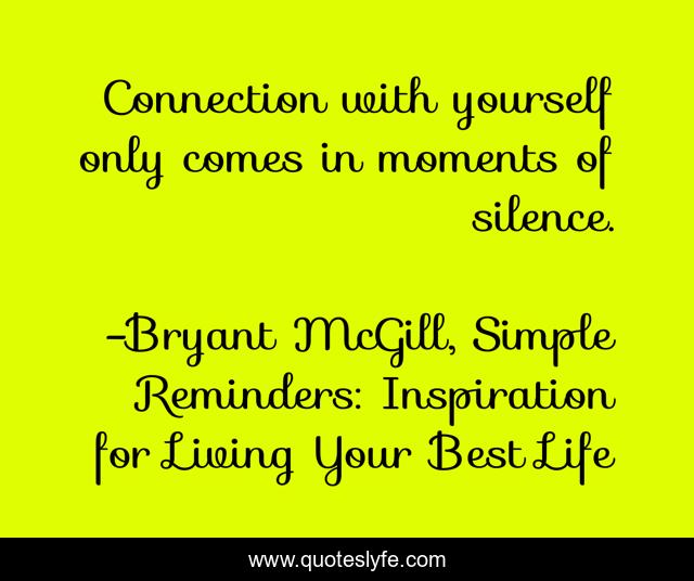 This page presents the quote "Connection with yourself only comes in moments of silence.". Author of this quote is Bryant McGill, Simple Reminders: Inspiration for Living Your Best Life. This quote is about connectivity, silence, momentary,.