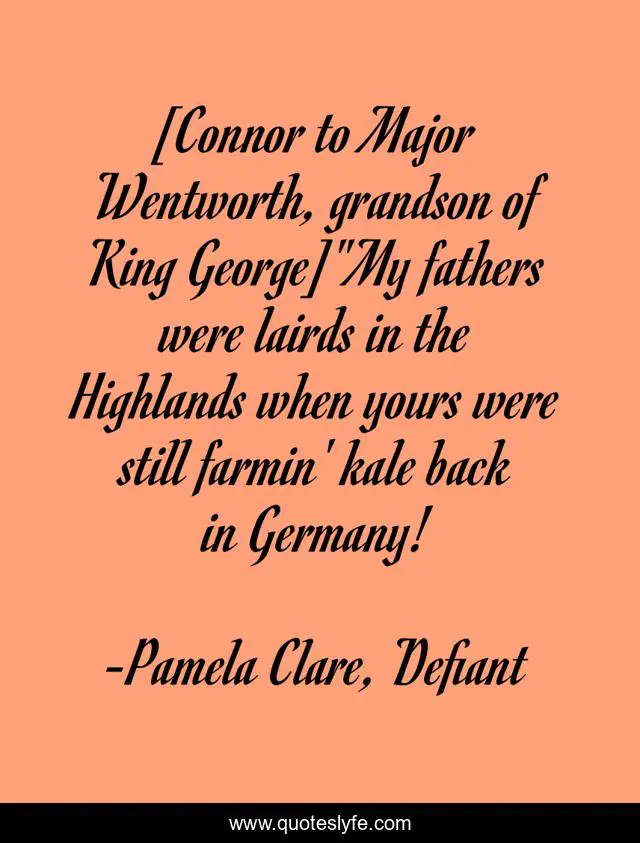 This page presents the quote "[Connor to Major Wentworth, grandson of King George]"My fathers were lairds in the Highlands when yours were still farmin' kale back in Germany!". Author of this quote is Pamela Clare, Defiant. This quote is about scottish-history, historical-romance,.
