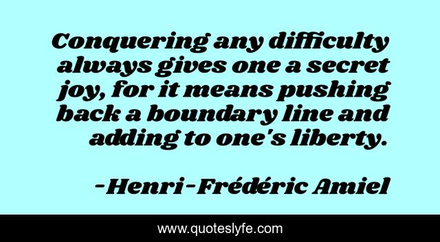 This page presents the quote "Conquering any difficulty always gives one a secret joy, for it means pushing back a boundary line and adding to one's liberty.". Author of this quote is Henri-Frédéric Amiel. This quote is about freedom, liberty, winning,.