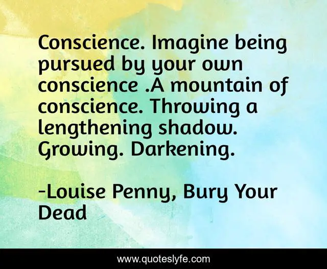 This page presents the quote "Conscience. Imagine being pursued by your own conscience….A mountain of conscience. Throwing a lengthening shadow. Growing. Darkening.". Author of this quote is Louise Penny, Bury Your Dead. This quote is about conscience, pursued,.