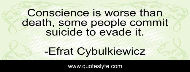 This page presents the quote "Conscience is worse than death, some people commit suicide to evade it.". Author of this quote is Efrat Cybulkiewicz. This quote is about suicide, self-awareness, consciousness, self-respect, death, suicidal-thoughts,.