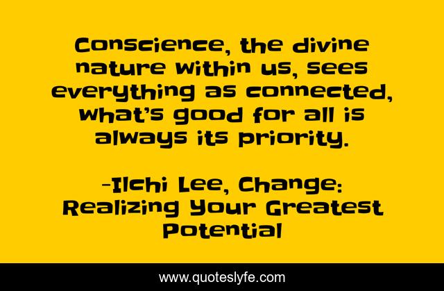 This page presents the quote "Conscience, the divine nature within us, sees everything as connected, what’s good for all is always its priority.". Author of this quote is Ilchi Lee, Change: Realizing Your Greatest Potential. This quote is about enthusiasm, inspirational, self-development,.