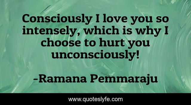 This page presents the quote "Consciously I love you so intensely, which is why I choose to hurt you unconsciously!". Author of this quote is Ramana Pemmaraju. This quote is about love, relationship, unconscious-mind, consciousnessious, hate, affection,.