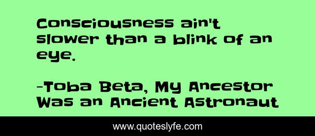 This page presents the quote "Consciousness ain't slower than a blink of an eye.". Author of this quote is Toba Beta, My Ancestor Was an Ancient Astronaut. This quote is about consciousness, blink-of-an-eye,.