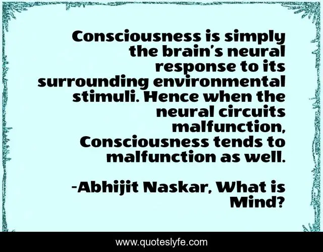 This page presents the quote "Consciousness is simply the brain’s neural response to its surrounding environmental stimuli. Hence when the neural circuits malfunction, Consciousness tends to malfunction as well.". Author of this quote is Abhijit Naskar, What is Mind?. This quote is about brainy, neurological-disorder, consciousness, consciousness-explained, science-of-mind, neurology, truth, neuroscience, consciousness-mind-brain,.