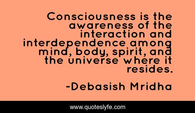 This page presents the quote "Consciousness is the awareness of the interaction and interdependence among mind, body, spirit, and the universe where it resides.". Author of this quote is Debasish Mridha. This quote is about theory-of-conciousness, consciousness, universe, philosophy, debasish-mridha, quotes, inspirational, enthusiasm, debasish-mridha-m-d,.