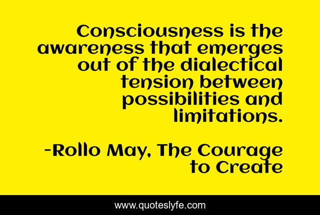 This page presents the quote "Consciousness is the awareness that emerges out of the dialectical tension between possibilities and limitations.". Author of this quote is Rollo May, The Courage to Create. This quote is about limitations, possibilities, consciousness,.