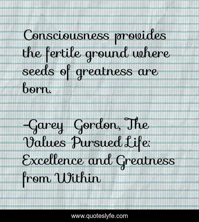 This page presents the quote "Consciousness provides the fertile ground where seeds of greatness are born.". Author of this quote is Garey Gordon, The Values Pursued Life: Excellence and Greatness from Within. .